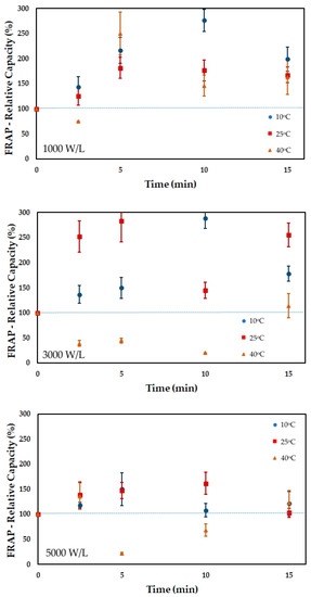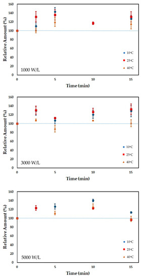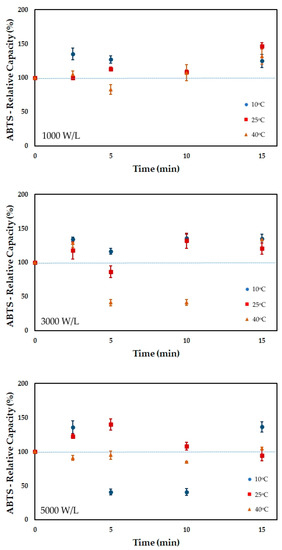 The retention of phenolic compounds after sonication strongly depends on the food matrix. For instance, the sonication of cantaloupe melon juice also decreased the amount of phenolics in the juice, reducing the initial content by 15 to 36% [19]. A different effect was attained for the sonication of pineapple juice, which increased the phenolic content by 10 to 30% [20].