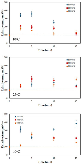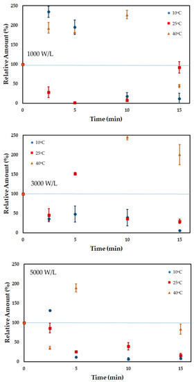 At higher temperatures (≥25 °C), a higher increase in carotenoid content was observed despite carotenoids having low thermal stability [48,52]. The higher carotenoid content may be related to the lower cavitation efficiency at higher temperatures. Under this condition, the sponge effect of ultrasound may play a significant role in extracting carotenoids from the liposoluble membrane while not producing excessive reactive oxygen radicals that would tend to be scavenged by the extracted carotenoids.