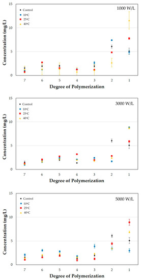 Sonication decreased the concentration of oligosaccharides with a higher degree of polymerization, with a consequent increase in the concentration of mono, disaccharides, and kestose (Figure 10). Mass balance analysis of the oligosaccharides evidenced that depolymerization of the oligosaccharides occurred.