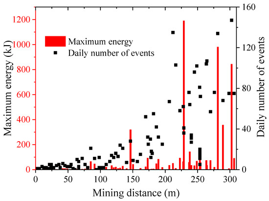 The distribution of microseismic events has an obvious density boundary in the vertical direction. The first boundary is about 50 m above the roof, and the second boundary is 100 m–120 m above the roof. The difference in the energies of microseismic events between the first and second boundaries is about 103–104 J, which is relatively large considering the source energy, as shown in