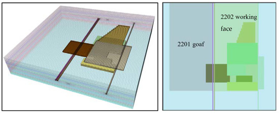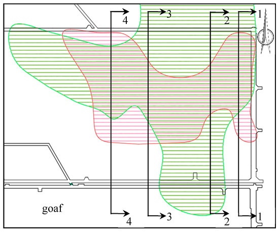 Figure 12 represent the coal seam (the location is determined on the basis of two roadways). The two blue translucent squares represent the drainage areas (the upper layer corresponds to the drainage area of the Zhiluo formation, while the lower layer is the drainage area of the Yan’an formation.). The dotted black, green, and blue lines represent the distribution trend lines of microseismic events.