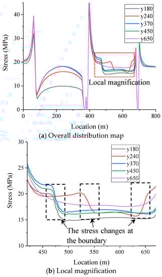 Figure 6, five lateral stress lines are compared and analyzed, which marks the interaction area between the 2201 mined-out area and abnormal water-rich area drainage. There is an evident step distribution in the regions between 450 m and 550 m, as well as at 650 m. To properly depict the existence of spatial islands, the area from 450 m to 650 m is enlarged. The lateral distribution stress line y650 is not affected by the hydrophobicity of the abnormal water-rich area. The interaction between the water-rich abnormal area and the goaf results in the formation of the high-stress area, as indicated by the step stress line crossing through the y650 stress line. However, the majority of the y180 stress line is located below the y650 stress line due to the influence of the mining boundary of the 2201 goaf.