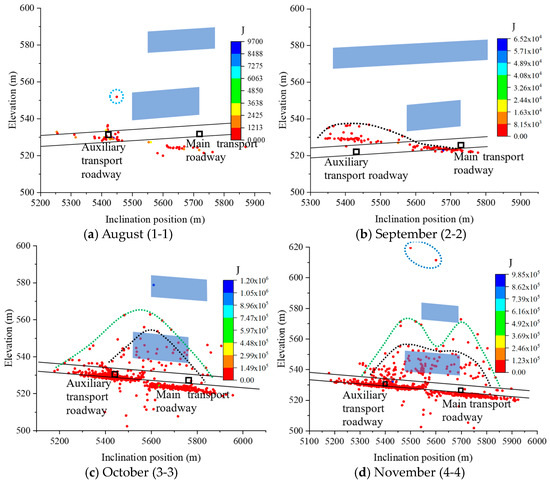 The distribution map of microseismic events observed in August, September, October, and November corresponds to profiles 1-1, 2-2, 3-3, and 4-4, respectively. The tendency of various distributions of the monthly microseismic event and the superposition of the corresponding profiles are shown in