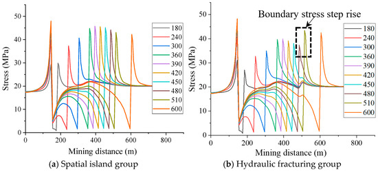 Figure 15, the leading stress peak curves of the spatial isolated island group and the hydraulic fracturing group with varying advancing distances exhibit certain distinct rules when mining in the hydraulic fracturing zone. At the boundary of the hydraulic fracturing zone, the peak value of leading stress increases rapidly, reaching the peak value under the condition of the spatial isolated island.