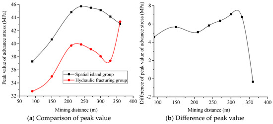 Figure 14. There is a significant fluctuation zone in the stress distribution of coal outside the leading influence zone. Furthermore, the peak value of leading stress is low, and there is a jump at the boundary when mining under hydraulic fracturing and water-rich abnormal areas. To better analyze the difference in leading stress between the spatial isolated island group and hydraulic fracturing group, the relationship between the peak value of leading stress and advancing distance between the two groups is analyzed, as shown in