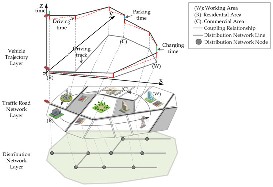 Electric vehicles have the dual characteristics of traffic and mobile load and the driving characteristics of electric vehicles, and their charge–discharge behavior links the urban distribution network and transportation network together; the model of the coupled “vehicle-road-network” system is shown in Figure 1. The topology and traffic saturation of the urban road network directly affect the driving speed of electric vehicles and motorists’ path decisions, which, in turn, affect the spatial and temporal distribution of charging loads and the state of the distribution network; therefore, it can be seen that the detailed portrayal of the trip characteristics of electric vehicles is the foundation for the establishment of the “vehicle-road-network” coupling system.