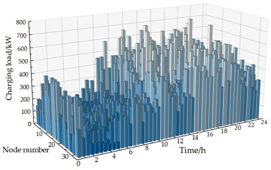 According to the characteristic quantity of electric vehicles, the total charging load at node i of the distribution grid at time t is calculated. The entire load of the nodes in different functional areas is then calculated by adding the grid node’s base load and the whole EV charging load, finally obtaining the spatio-temporal distribution of the EV charging load. The prediction model predicts the first 24 h at an interval of 1 min, as shown in Equation (21):