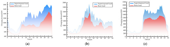 Figure 8c depicts the charging load distribution in the commercial area, with EV charging loads beginning to grow significantly at 12:00 p.m. and 20:00 p.m., the peak business hours in commercial regions, which is in line with the business characteristics of the commercial area.