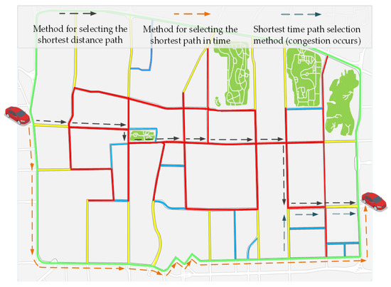 Analysis of Table 2 shows that the path length planned by the shortest route selection method is 35.14% longer than that planned by the traditional shortest route selection method, but the shortest route selection method is 28.79% less than the traditional shortest route selection method in terms of travel time. Additionally, when a section of the planned route is congested, the replanned route consumes 5.11% less time than the original route which was previously congested, verifying that the shortest route selection method may make users effectively avoid paths with the shortest distance but low road speed limits and congested road conditions.