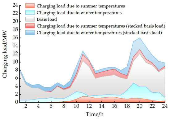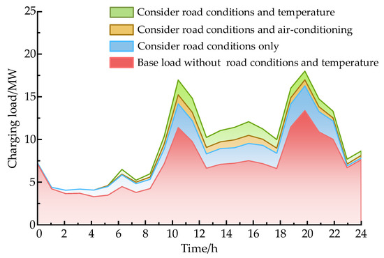 From Figure 10, it can be seen that traffic conditions and ambient temperature factors have a greater impact on charging load. Taking the high-temperature environment in summer as an example, in the case of considering only the traffic road conditions, the peak hours of vehicle travel are 7:00–10:00 a.m. and 18:00–20:00 p.m., corresponding to the high saturation of the traffic road sections at this time. The traffic mileage consumption of vehicles in the process of driving increases, and the charging load starts to surge at this time. After 22:00 p.m., the saturation of traffic road sections is low, owing to the comparatively small number of vehicles on the road, and the energy consumption of traffic miles caused by traffic road conditions starts to decrease. In the case of considering only the traffic factor on the charging load, the charging load caused by the traffic road condition during the peak travel period increases by 30.63% compared with the case that does not consider the traffic road condition, obtaining an overall increase of 20.97%. In the case where only the ambient temperature causes the air conditioning to turn on, as the ambient temperature gradually increases over time, the electricity expenditure of the on-board air conditioning caused by the ambient temperature begins to rise continuously during the high-temperature hours of 10:00 a.m.–16:00 p.m., increasing the charging load by 12.90% compared to the charging load without the on-board air conditioning, with an overall increase of 6.52%. Considering only the battery loss due to ambient temperature, the charging load during the high-temperature period increases by 17.63% compared to that which does not consider the battery loss due to ambient temperature, obtaining an overall increase of 9.74%. The overall charging load increases by 38.28% compared to charging loads that do not take these two factors into account, verifying the validity of the model.