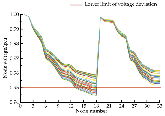 As seen in Figure 14, node 18 is also the most affected as it is far away from node 1, the power node, and, as the electric vehicle is connected to node 18, the node voltage at this node drops from 0.9631 to 0.9447, which exceeds the lower limit of the node voltage.