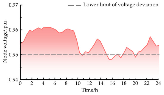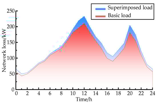 Figure 15 clearly shows that, around 12:00 p.m. and 20:00 p.m., the overall network loss of the distribution network is larger because there are more EV charging loads at each functional area node during this time period. Under the base load, the peak losses are 0.199 MW and 0.172 MW, respectively, and when the charging load is linked, the peak losses are 0.220 MW and 0.193 MW, respectively, increasing by 10.6% and 12.5%. It can be seen that, along with the charging load being connected to the distribution network, the distribution network’s network loss increases considerably, posing a serious threat to the distribution network’s safe and economical functioning.