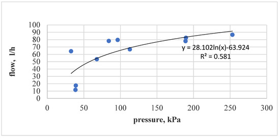In the same way as in the above examples, the filtration parameters were determined for other pressure values in the range of 0–250 kPa. The dependence of oil flow through the filter on the pressure can be seen in Figure 3.