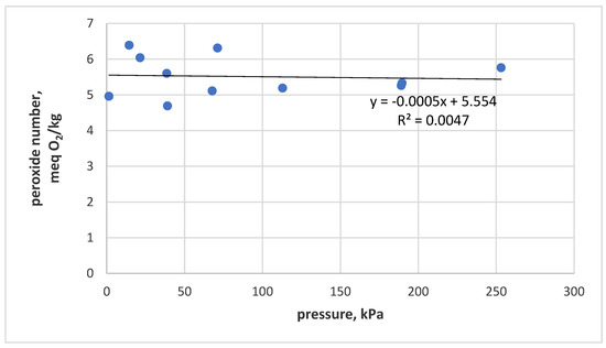From the statistical evaluation and the graphical representation of the results in Figure 4, it is clear that the oil pressure during the filtration does not have, in the observed range, a significant impact on the peroxide number.