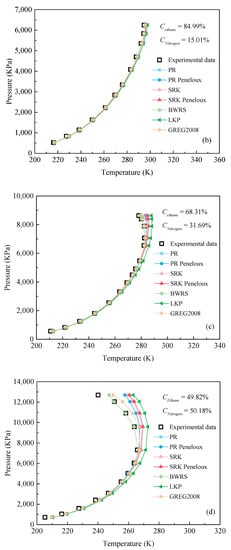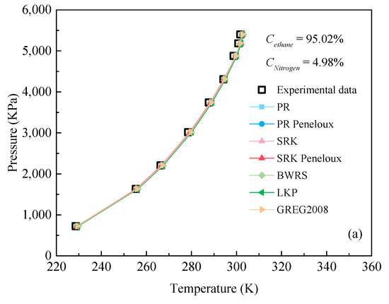Figure 3 shows the comparison of dew point of C2H6-N2 mixture between experimental data and calculation results by different EOSs under different working conditions (pressure: 0.52~13.01 MPa, temperature 192.52~301.7 K). Obviously, all the predicted values of all EOSs almost coincide with the corresponding experimental data when the concentration of ethane is higher than 84%, as shown in Figure 3a,b. However, with the continuous decrease of ethane concentration (ranging from 49.82% to 84.99%), some deviations between the predicted values of the EOSs and the experimental data began to appear, and the smaller the concentration of ethane, the greater the deviation, as shown in Figure 3c,d. However, when the concentration of ethane is lower 49.82%, the deviation between the predicted value and the experimental value of the equation of state begins to decrease. In addition, it also can be found from Figure 3 that BWRS EOS can accurately predict the dew point value of C2H6-N2 mixture for all ethane and N2 mixed ratios.
