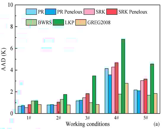 In order to select the optimal EOS applicable to all working conditions, the values of AAD and ARD under above five working conditions are averaged again, as shown in Figure 5. Obviously, the average AAD and ARD values of BWRS EOS are the smallest, with values of 1.40 and 0.58%, respectively. Namely, the BWRS EOS has the best performance for predicting the dew point of C2H6-N2 mixture regardless of the mixed ratio of C2H6 and N2. On the contrary, the LKP EOS exhibits the worst performance for predicting the dew point of C2H6-N2 mixture, and the corresponding values of AAD and ARD are 3.75 and 1.50%, respectively. The reason for this is that in the process of calculating the dew point of C2H6-N2 mixture, the mixing rule used in the LKP EOS to calculate the multi-comp virtual critical parameters has a deviation, which lead to a large deviation in the LKP EOS.