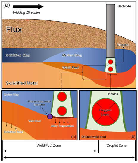 Reaction zones that control compositions in SAW: (a) overall schematic diagram of SAW, (b) droplet zone, (c) weld pool and solidification zones [13].