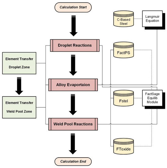 The previous study provided a detailed report on the modeling and quantification of chemical reactions, specifically focusing on those occurring within the weld pool zone [23,24,25]. This study, on the other hand, focuses on evaluating the transfer behaviors within both the droplet zone and weld pool zone, aiming to understand the transfer mechanisms in these specific regions. Figure 2 depicts the overall modeling procedure, where white represents modeling tools, yellow represents the employed databases, red represents simulated chemical reactions, and green represents quantification of elemental transfer behavior. The star and dashed lines mean the databases employed for the Equilib Module. The simulation results will be provided in this part.