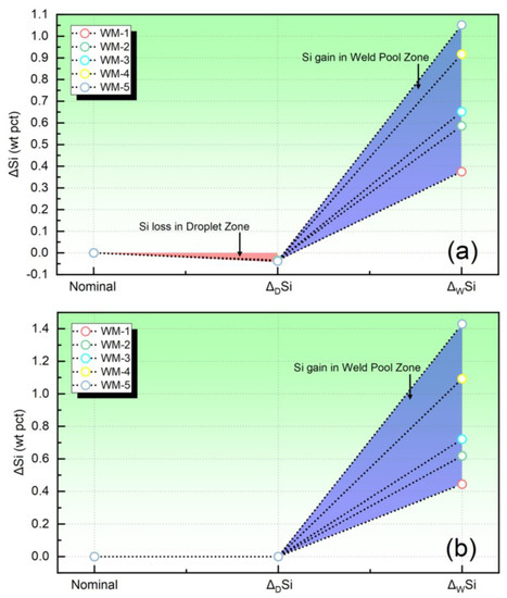 In previous work, only the elemental transfer behaviors within the weld pool zone have been considered, the level of which has been elucidated elsewhere [22]. Herein, the level of elemental transfer is quantified subject to both the zones of the drop and weld pool via the approach provided in Section 2.2.