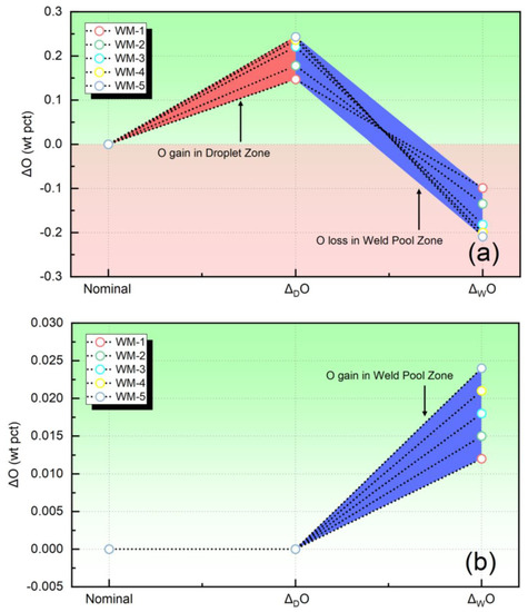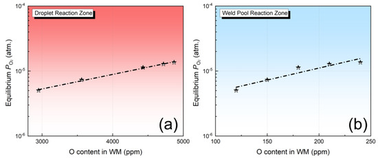 As illustrated in Figure 5a,b, in both the droplet and weld pool zones, the O content in the metal typically rises as the equilibrium partial pressure of O2 increases. These findings are fully consistent with the three scientific hypotheses mentioned above.