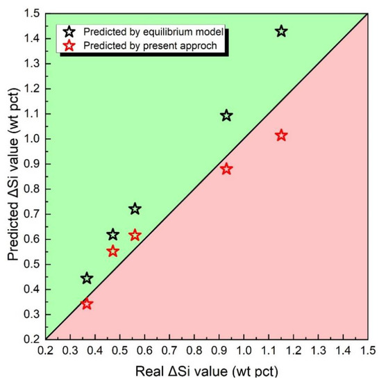 Through the observation of Figure 6, it can be discerned that the black pentagon is closer to the black diagonal line in comparison to the red pentagon. This suggests that traditional thermodynamic equilibrium models may have overestimated the value of ΔSi. According to Equation (2), the value of ΔSi can be evaluated by Equation (10), where [pct Si]N represents the nominal manganese content, αSiO2 represents SiO2 activity, and [pct O] represents predicted O concentration in metal.