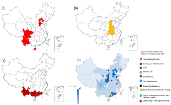 Distribution of (a) titanium ore, (b) ilmenite illustrates, and (c) rutile in China. The regional heat map of (d) the number of enterprises in the titanium industry chain and the distribution of major listed companies in the titanium industry chain.