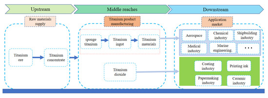 Based on the research methods used in other metal industry chains and the existing literature on the development of the Ti industry, this study conducted a safety evaluation of the Ti industry chain. The evaluation process considered the entire industry as the evaluation object and took into account the development status and industrial composition of China’s Ti industry. It analyzed the main factors affecting the safety of the Ti industry, constructed a quantifiable evaluation index system, and used certain theoretical methods to evaluate the Ti industry. The evaluation aimed to provide a comprehensive assessment of the historical and current state of the Ti industry. Due to data limitations, it was not feasible to cover every aspect of the industry. Therefore, this study focused on the quantitative analysis of important indicators upstream (raw material supply), midstream (Ti product manufacturing), and downstream (market application) in the Ti industry chain. The Ti industry chain is illustrated in Figure 2.