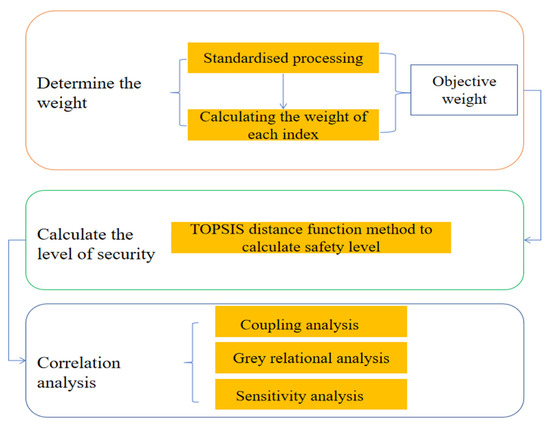 In this study, the entropy weight-TOPSIS [31] distance function model was used to quantitatively model the safety evaluation of the Ti industry in China. The model consists of three main parts, as illustrated in Figure 3, to ensure a robust and accurate assessment process.