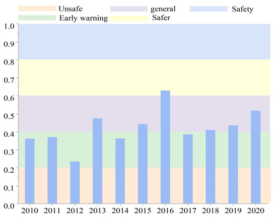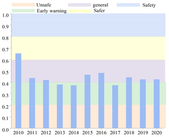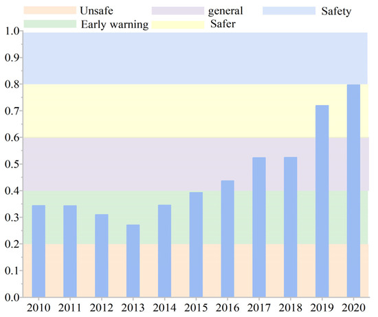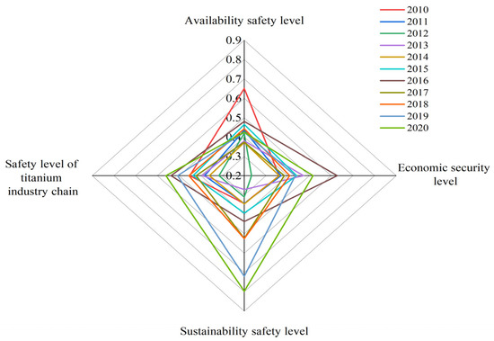 According to the calculation of the comprehensive safety level of the Ti industry using Equations (7)–(10), Table 3 lists the safety levels in the Ti industry from 2010 to 2020.