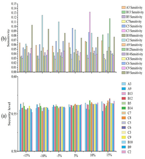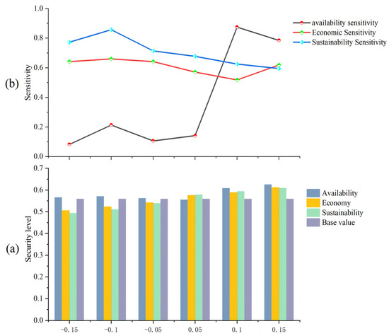 Based on 2020, the combination of influencing factors was adjusted at the rate of change of −15, −10, −5, 5, 10, and 15%, and sensitivity analysis of the security dimension of the Ti industry chain was performed.