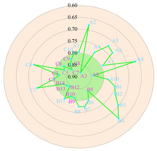 It can be observed from Table 2 that during the evaluation period, the largest average weight is that of the titanium self-sufficiency rate (A4) indicator. The smallest indicator is the net profit margin of titanium products (B14), whose weight value is 0.013–0.057. According to the development status of the Ti industry during the evaluation period, the weight of each index is essentially in line with the development status.