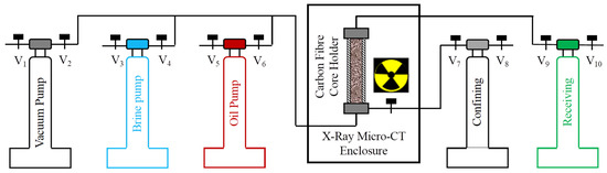 In situ scanning was performed throughout the experiment without changing the core holder; this was referred to as 4D X-ray tomography in certain reports [29,30]. The core-flooding experiment steps contain brine flooding and oil flooding. The specific experimental steps are as follows: