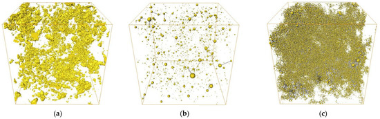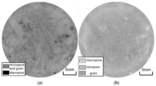 However, micro-porosity can not be identified because carbonate rocks are prone to micropores and because scanning accuracy (3 μm) is limited. The differential imaging method is used to identify micro-pores. Figure 3a,b are cross-sectional views of dry samples and samples saturated with 30 wt.% KI salt water, respectively. Using high-concentration KI salt water can make the aqueous phase have a strong X-ray absorption capacity and make the water-bearing area brighter. It can be seen that the solid particles are saturated after using KI brine. The solid particle area with micro-pores is gray due to the existence of KI brine. The dry scanning image is subtracted from the saturated salt water scanning image to obtain different images, in which the black area is the rock skeleton, the white area is the micropore, and the gray area is the micro-pore, which makes the micro-pore area easier to distinguish (Figure 3c).