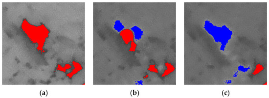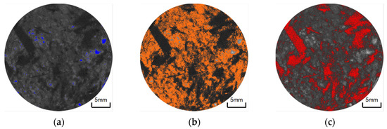 Horizontal cross-sectional slices of Core 2. (a) Oil saturated state; (b) 0.1 PV; (c) 20 PV, where oil and brine are red and blue, respectively.