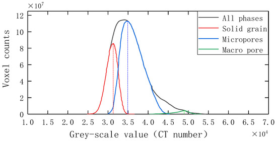 The method of distinguishing the solid macro-pores and micro-pores is different from the previous. The method used in this paper is to extract the macro-pores using the watershed algorithm on the dry scanning image. The macro-pores part of the mask was removed from the differential image, and the watershed algorithm method was used again to distinguish the solid grains and micro-pores in the remaining part. The CT gray values distribution map of the three phases was obtained from the dry scanning image, and the peak values of the three phases were taken as the CT gray values of solid grains, macro-pores, and micro-pores to calculate the porosity of the micro-pores (Figure 4), calculated as follows: