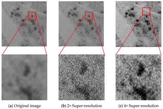 By extracting the internal feature information of the image after super-resolution processing, the missing details in the magnified image are compensated, and the image resolution and contrast are improved at the same time. The sub-resolution pores inside the carbonate rock that could not be identified in the original image are captured. The differences between the three images are compared in Figure 6. The pores that could not be distinguished in the original image are reflected in the 2× super-resolution image, while the 4× super-resolution image shows more pores that cannot be distinguished in the original image. There is no significant increase in noise. It is proved that the 4× super-resolution image processing can ensure both the improvement of the image resolution and the stability of the image.