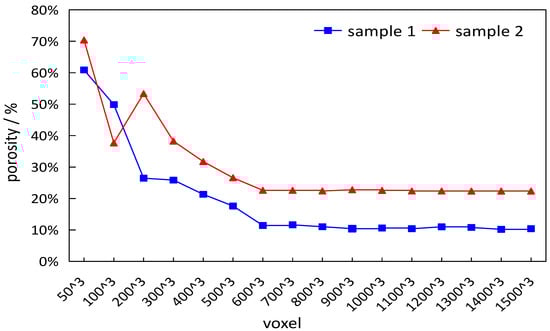 The data blocks with different lengths are sheared, and the macro-porosity and micro-porosity of each cube are obtained. The length of the cube ranges from 50 pixels (150 μm) to 1500 pixels. As shown in Figure 7, with the increase in the amount of data, when the length of the scanned cube is greater than 500 pixels, the change of each parameter curve gradually tends to be horizontal. Therefore, it is determined that the basic volume of the research object is a cube with a side length of 500 pixels.