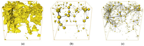 Pore network model of Sample 2. (a) Pore space can be identified; (b) Pore throat network model before processing; (c) Pore throat network model after processing.