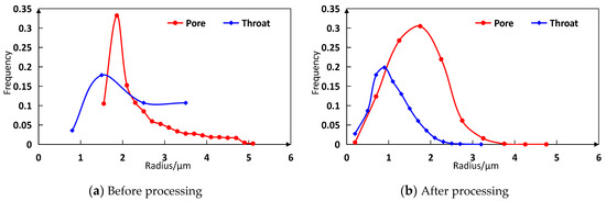 By simulating the pore network of the extracted pores, taking Sample 1 as an example to compare the pore-throat network model before and after processing, combined with the distribution frequency and coordination number, it can be found that there are many micro-pores in the core that cannot be directly identified by CT scanning. Pores with a radius of less than 1.5 μm and throats with a radius of less than 0.8 μm could not be identified before processing, while pores and throats with higher precision could be identified after processing. Figure 10 compares the frequency of pore throat distribution before and after treatment. A comparison of the number of pore-throat identifications before and after processing the two samples is shown in Table 3. It can be found that the number of pore identifications in the Sample 1 image after processing is 47.88 times higher than that of the untreated pore identification number, and the number of throats is increased by 10,443.38 times. The number of identifications is increased by 9.09 times, and the number of throat identifications is increased by 92.79 times.