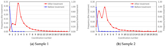 As shown in Figure 11, the coordination number of the two samples before treatment is mainly 0, which means that many pores are in an independent state and are not connected, but after treatment, it can be found that most of the pore throats are in a connected state. Combined with the number and distribution of pore throats, it shows that there are many pores and throats in the actual core that cannot be directly identified by CT, and there are a large number of sub-resolution pore throats in low-permeability samples as connecting channels for oil-water migration.