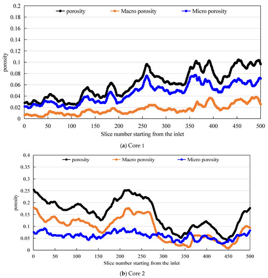 We calculated the micro- and macro-porosity (Figure 12). The porosity in Core 1’s slice numbers 2–40, 98–172 was high, but the overall distribution was relatively uniform from the slice map of porosity. The extreme difference in porosity between slices is 6.50%. After identifying the micro-pores, the extreme difference in micro-pore porosity is 3.70% and the extreme difference in macro-pore porosity is 5.55%. The porosity in Core 2’s slice numbers 0–150, 200–315, and 350–446 was high, and the overall distribution was relatively not uniform from the slice map of porosity. The extreme difference in porosity between slices is 28.69%. After identifying the micro-pores, the extreme difference in micro-pore porosity is 2.39% and the extreme difference in macro-pore porosity is 28.29%. The results indicate that micro-pores have a greater impact on Core 1, while macro-pores have a greater impact on Core 2. It is proved that the cores with more micro-pores have poorer physical properties, while the cores with more macro-pores have better physical properties. It can be seen from the figure below that Core 1 has more contribution from micro-pores and Core 2 has more contribution from macro-pores.