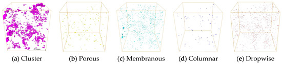 A detached oil ganglion can be isolated and quantitatively characterized using topological morphology analysis of leftover oil based on the form factor, Euler number, and contact ratio. Table 4 shows the computation formula and physical meaning of the shape factor, Euler number, and contact ratio. According to the five flow regimes, the remaining oil can be categorized from hard-to-produce to easy-to-produce. Membranous flow, droplet flow, columnar flow, multi-porous flow, and clustered flow are all examples of it [34]. The exploitation method for multi-porous flow and clustered flow is to increase microscopic sweep efficiency, such as polymer flooding or polymer microsphere displacement. In general, the exploitation method for membranous flow, droplet flow, and columnar flow increases the microscopic displacement efficiency, such as surfactant flooding.