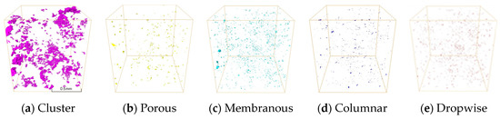 As shown in Figure 15. Comparing the proportions of the remaining oils of the five types before and after treatment, it was found that the proportions of cluster, porous, film, and residual oils decreased, while the proportions of columnar and droplet residual oils increased. Since the recognition accuracy of the processed images for small pore throats is improved, more residual oil in the pore throats can be identified, and the residual oil in the form of droplets is easily adsorbed in the small pore throats, so the proportion of residual oil in the form of droplets increases. By identifying more fine pore throats, a lot of remaining oil in a connected state that has not been identified before can be found, but the number of connected adjacent pore throats is less than five, which belongs to porous residual oil, so the proportion of porous residual oil increases.