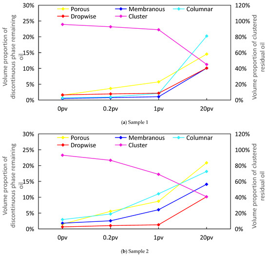 Further statistics on the volume ratio of the two kinds of microscopic remaining oil in different states can be found in Figure 9. As a result of the above discussion, the continuous phase was gradually broken up into discontinuous phases as the flow rate increased.