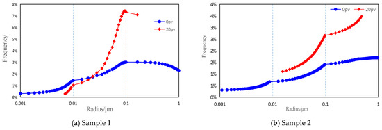 Relationship between pore throat radius and frequency before and after treatment of Sample 1.