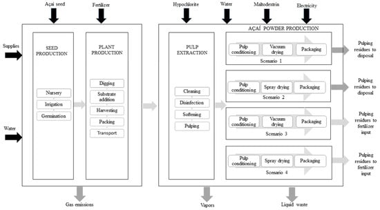 The goal of this study was to determine and compare the environmental performance of four different routes for valorizing the açaí pulp into açaí–maltodextrin powder. As previously mentioned in the introduction, the goal was to identify strategies for optimizing future commercial açaí powder production drying methods from an environmental standpoint. As illustrated in Figure 1, the scope of the study is from cradle to gate, comprising the following stages (see Figure 1): seed production, including nursery, germination, and irrigation; plant production, including digging, substrate addition, harvest, packaging, and transport; pulp extraction, including cleaning, disinfection, softening, and pulping; Scenario 1: pulp conditioning, vacuum drying, and packaging; Scenario 2: pulp conditioning, spray drying, and packaging; Scenario 3: pulp conditioning, vacuum drying, and packaging with the reuse of pulping wastes; and Scenario 4: pulp conditioning, spray drying, and packaging with the reuse of pulping wastes.
