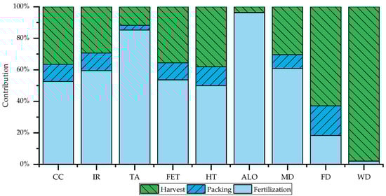 In the cultivation of açaí, the addition of organic fertilizer contributes 53% in the CC category, but in other categories, it had a greater impact, such as in ALO, IR, and FET with 96%, 60%, and 53%, respectively (See Figure 2).