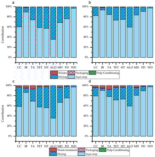 Contribution of the main categories to the total environmental impact for producing one kg of açaí powder under proposed scenarios (a) Scenario 1; (b) Scenario 2; (c) Scenario 3, vacuum drying; (d) Scenario 4, spray drying.