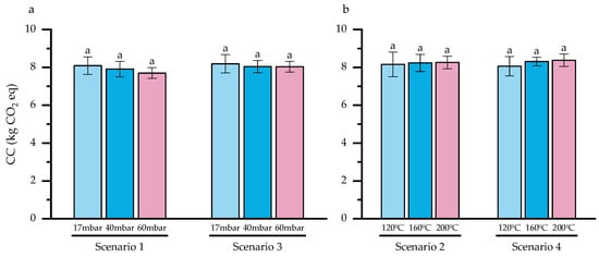 According to Figure 4, the spray drying Scenarios (2 and 4) exhibit a minimal escalation in their environmental footprint, and no significant difference was observed between the scenarios and temperatures. This is because the energy required to heat the air from 120 °C to 140 °C or 200 °C is relatively insignificant compared to the total energy consumed during the drying process (0.54, 0.77, and 1.2 kWh, respectively).