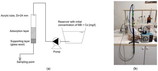 Scheme of the experimental fixed-bed column (a) and photo (b).